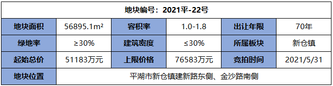 2021平-22号地块,位于新仓镇建新路东侧、金沙路南侧。该地块与2021平-14号较为接近,但出让面积是三宗住宅用地中最大的一宗,出让面积为56895.1m²。该地块报价达到上限价格76583万元时锁定限价,转入竞报无偿配建住宅程序。