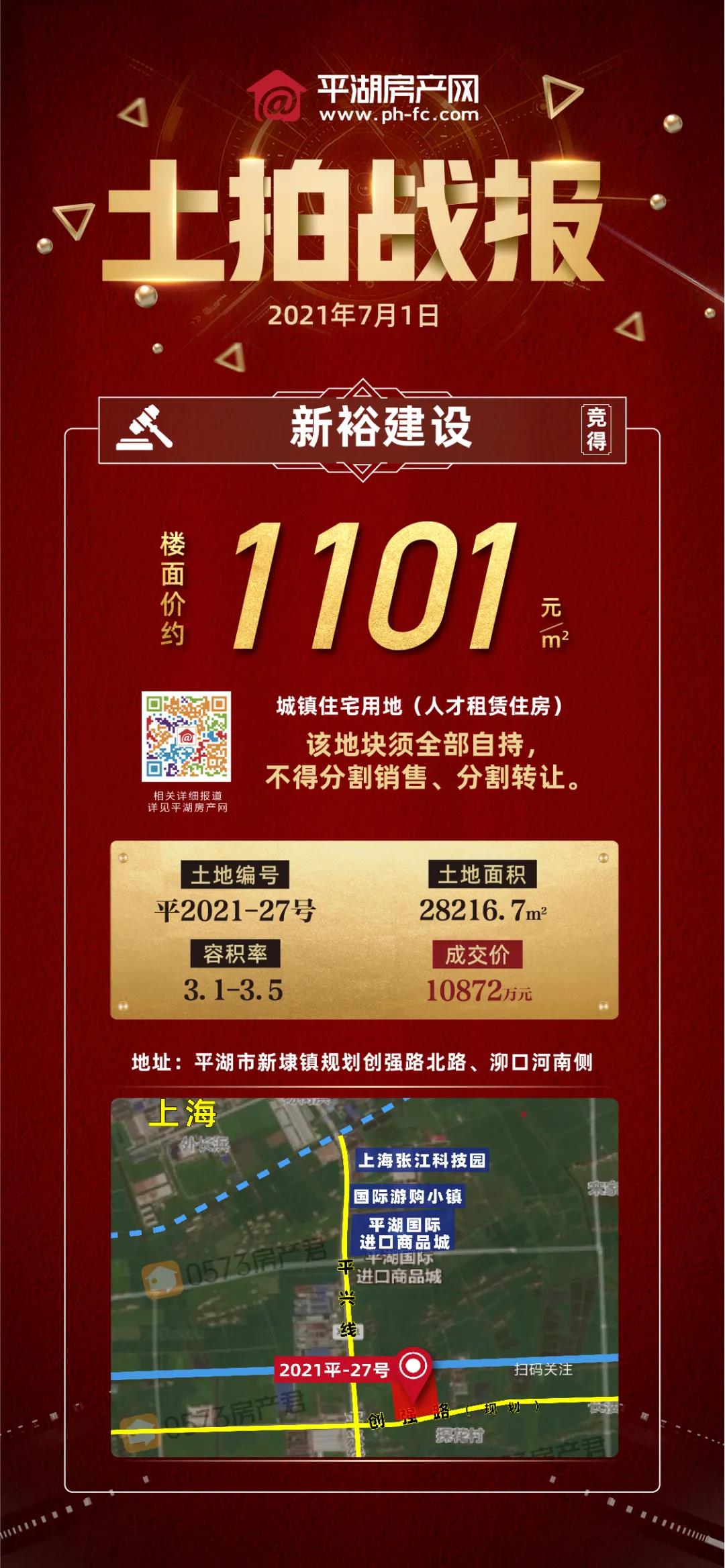 最终由新裕建设,以楼面价1101元/㎡,总价10872万元,竞得该地块。