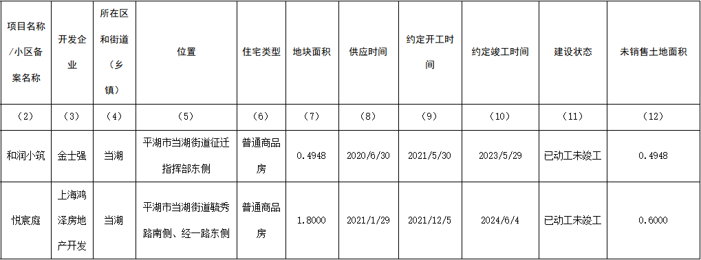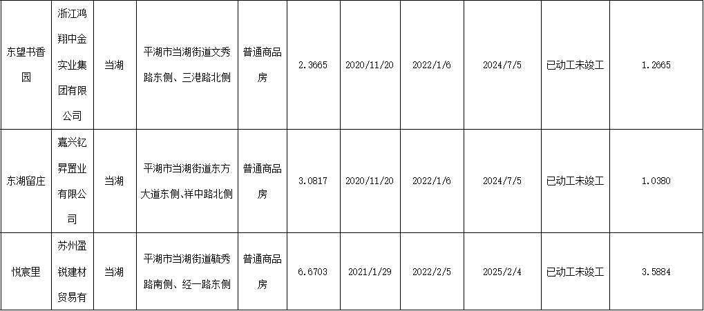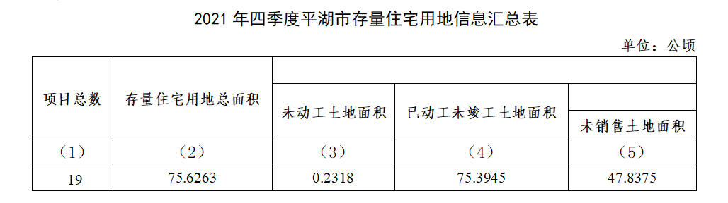 近日,平湖市自然资源和规划局公示了2021年四季度平湖市存量住宅用地项目情况。据统计,截至2021年四季度平湖市存量住宅用地总面积约75.6263公顷,其中未动工土地面积0.2318公顷,已动工未竣工土地面积75.3945公顷,未销售土地面积47.8375公顷。其中,当湖街道住宅未销售土地面积约18.32公顷,涉及悦宸里、悦宸庭、尚品美寓、四季华庭、和润小筑、东望书香园、传承樾府、东湖留庄8个项目。钟埭街道未销售土地面积约3.89公顷,主要涉及花漫里和东福城;而曹桥街道未销售土地面积约4.65公顷。