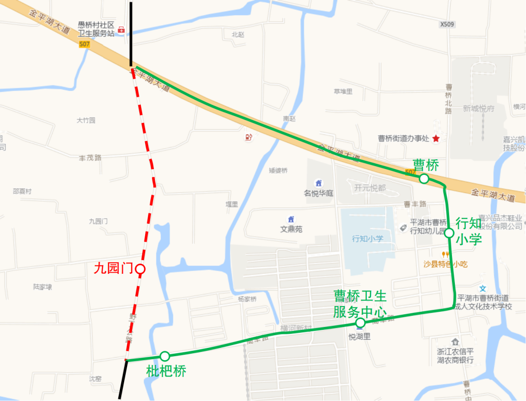 原野丁公路(高丰路—新07省道段)线路走向优化调整为野丁公路—高丰路—九场公路—新07省道—野丁公路,取消停靠九园门站点,新增停靠枇杷桥、曹桥卫生服务中心、平湖行知小学东、曹桥等4个站点。