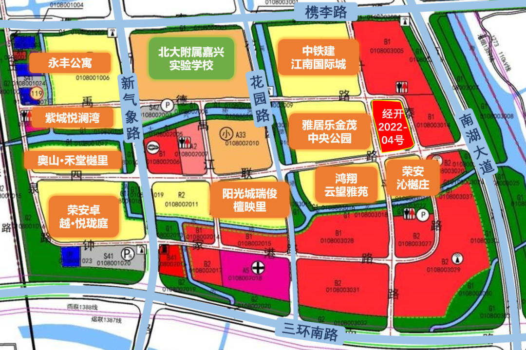 2022南-004号地块,位于嘉兴主城区二环内,华梦锦园西侧,佳源都市南侧。地块起始楼面价5894元/m²,最大容积率2.0,限高30-80米,预计产品是小高层+高层排布。