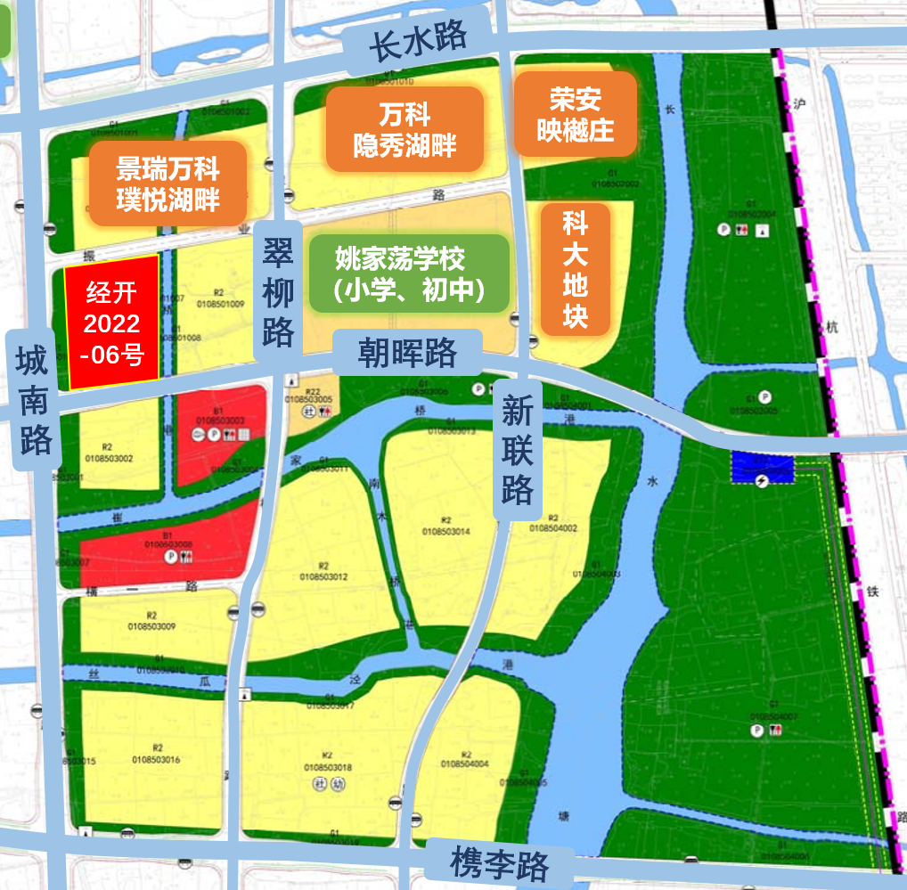 经开2022-06号地块,位于城南姚家荡板块,景瑞万科璞悦湖畔南侧。地块起始楼面价10676元/m²,最大容积率1.7,限高30-45米,预计产品是小高层。