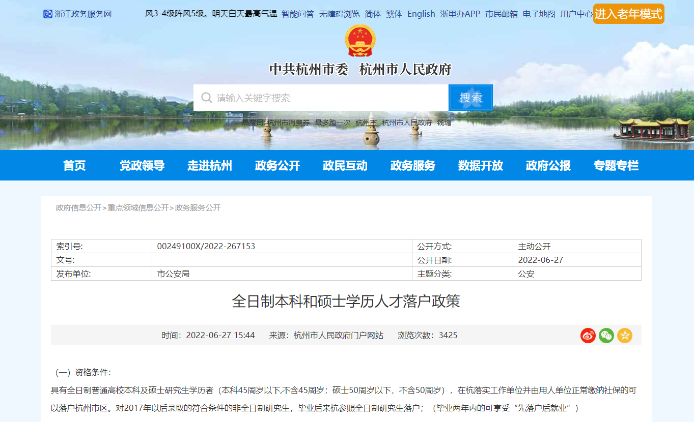杭州:本科及硕士可直接落户