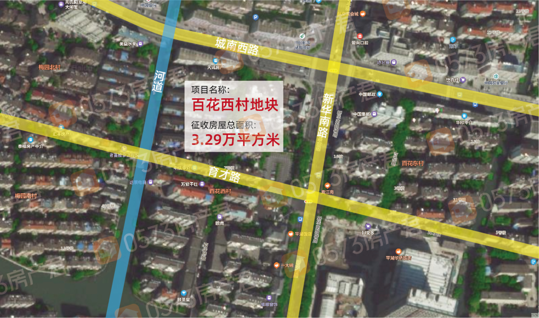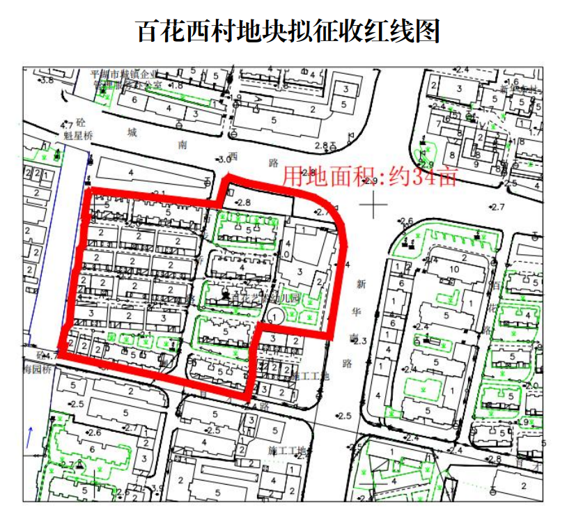 百花西村位于城南西路和新华南路的交汇处。征收范围东至新华南路、南至育才路、西至河道、北至城南西路。