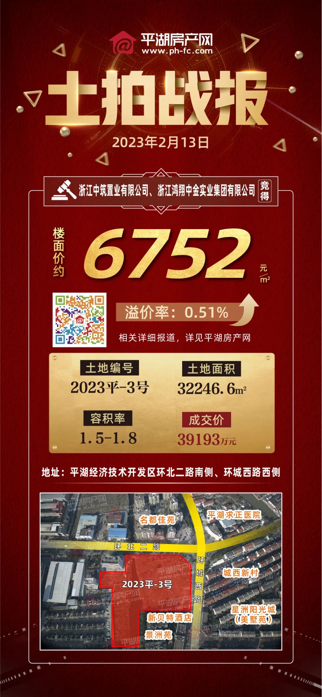 2月13日,2023平-3号地块,经过3轮报价,以39193万元成交。比较意外的是,竞得单位不是一家房企,而是“中筑+鸿翔”的强强组合。平湖2023年首场土拍就收获“开门红”,这对于2023年平湖楼市具有风向标的意义。关于这宗宅地的详细报道,可点击此处(传送门)进行查看。