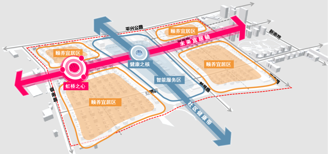 虹桥景苑社区未来社区按照“一统三化九场景”的创建要求,重点关注“一老一小”特殊需求,以一心一轴一核一带五片区的功能布局,全力开展未来社区创建工作,打造邻里中心、养育托幼中心、健康绿道、社区环境提升、智慧停车场、未来社区数字平台、芦席路延伸段等涉及到环境提升、健康休闲、数字化改革、助民便民等多个方面,更具归属感、舒适感、幸福感和未来感的未来社区。